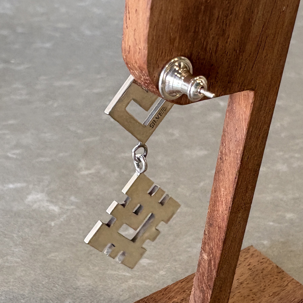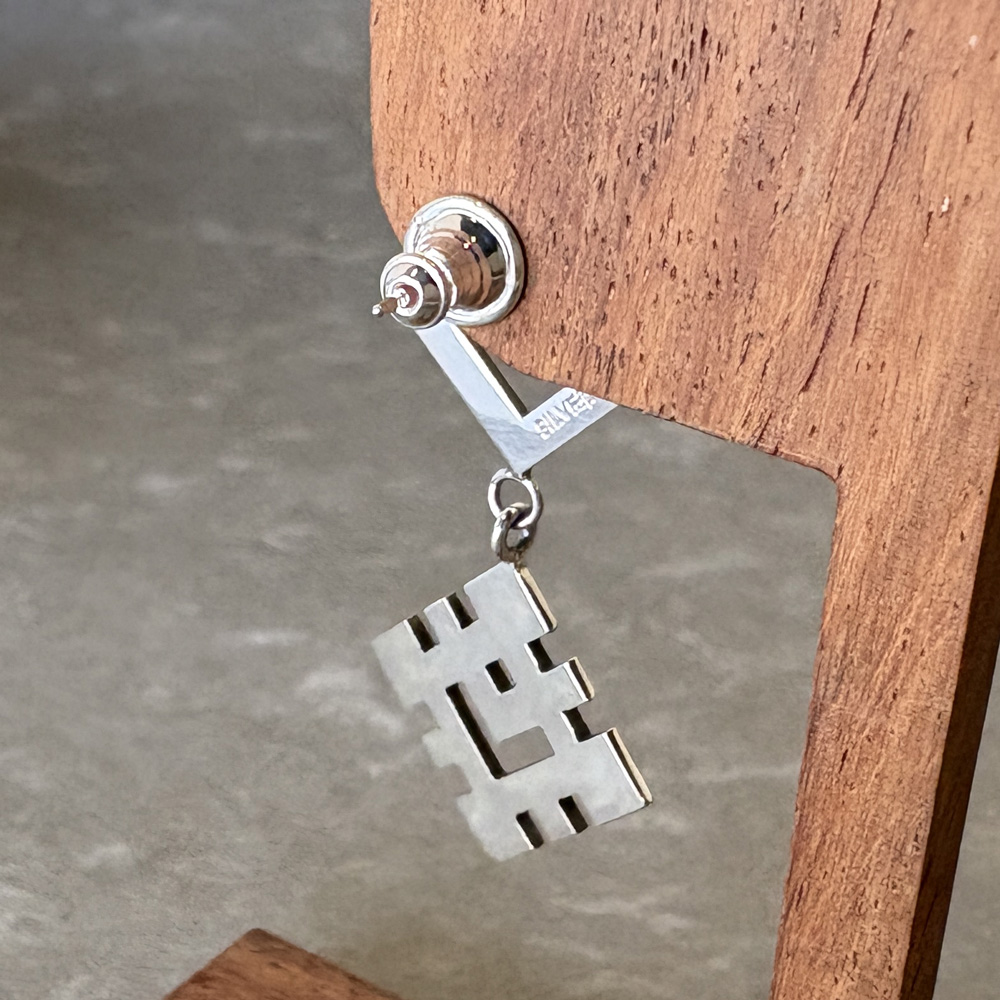 四角をベースにドット絵のような、2mmの四角をデザインの基本ルールとして切り抜く部分と銀の部分とで模様を作っています。